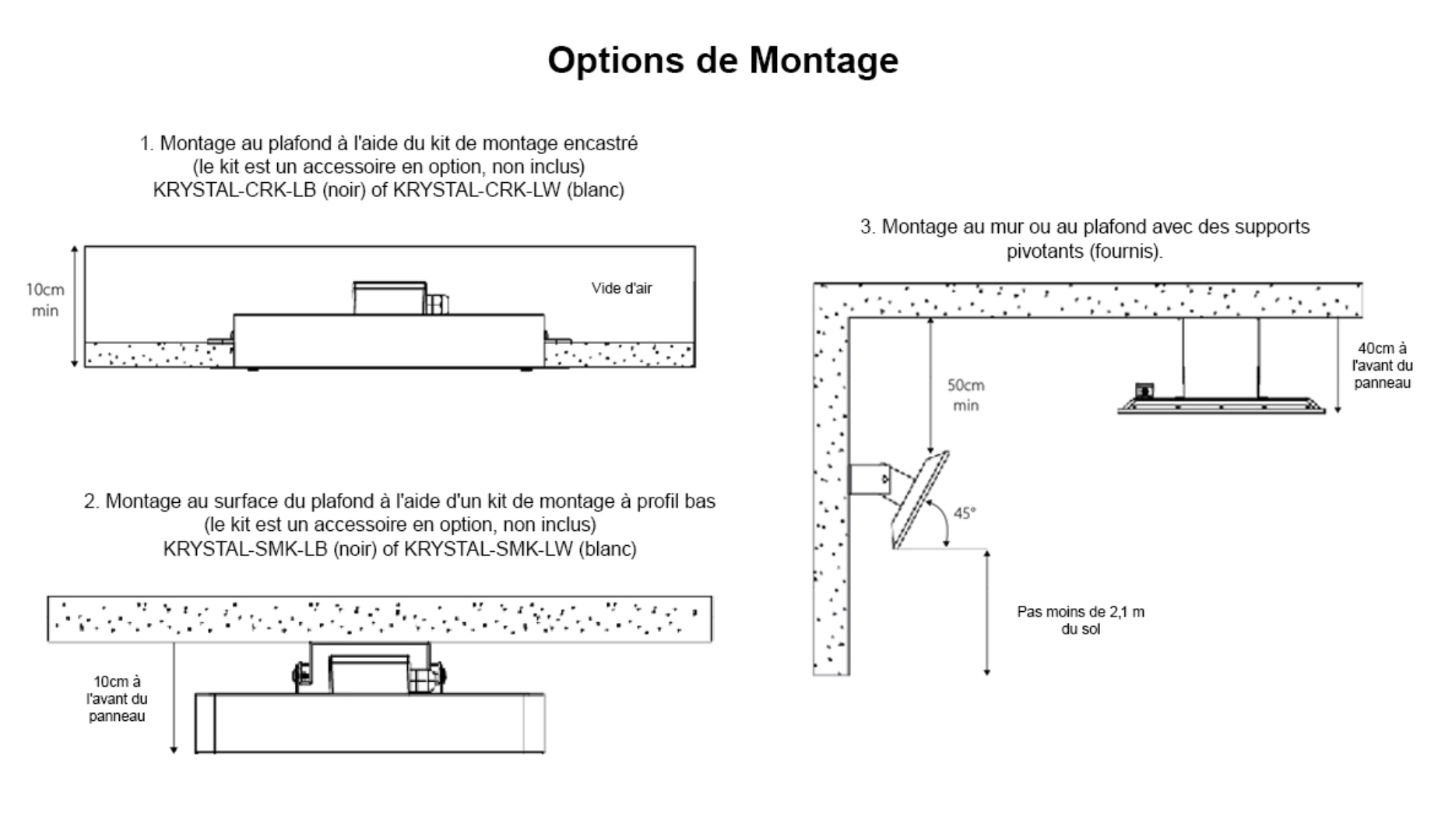 Conçu principalement pour une installation au mur ou au plafond (sa configuration la plus performante), le Krystal offre une polyvalence de pose remarquable.
