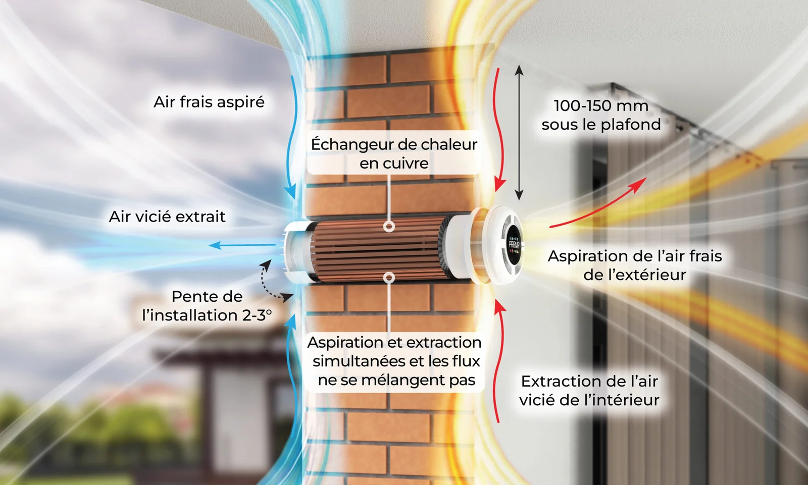 Chaque unité Prana s'installe directement à travers le mur extérieur et fonctionne de manière autonome, sans réseau de gaines. Grâce à un échangeur thermique en cuivre à haut rendement, l'air vicié extrait de la pièce transfère sa chaleur (ou sa fraîcheur en été) à l'air neuf entrant, permettant une récupération d'énergie jusqu'à 90 %. Le résultat : une ventilation continue, économe et respectueuse du confort thermique.