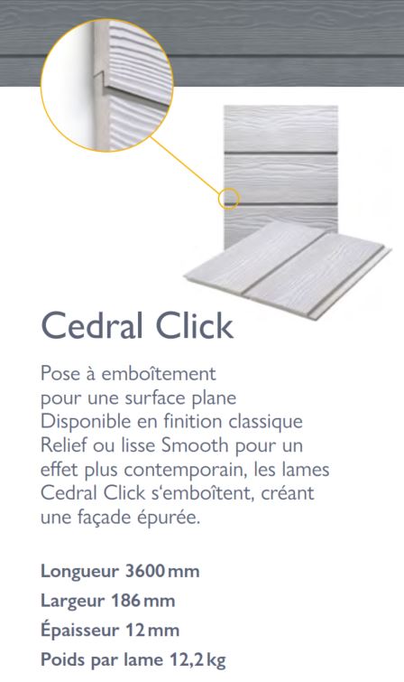Les lames de bardage Cedral Click pour une pose à emboîtement, offrent une finition plate, moderne et élégante. Elles sont idéales pour les extensions, les nouvelles constructions et les rénovations. Avec leur système de rainure et languette affleurant les lames s'emboitent facilement et permettent une pose rapide grâce à un système de clips ingénieux.