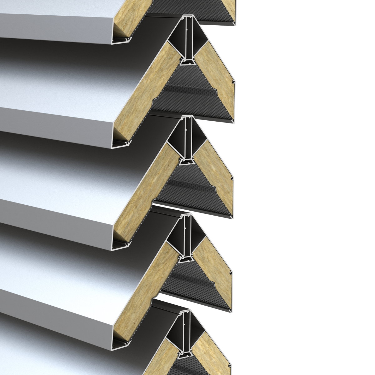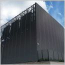 Cloison à lamelles réalisée à partir de profilés extrudés en aluminium. La face intérieure des lamelles est recouverte de laine minérale ininflammable et insonorisante. Les lamelles en aluminium sont encliquetées sur des porte-lamelles en matière plastique.