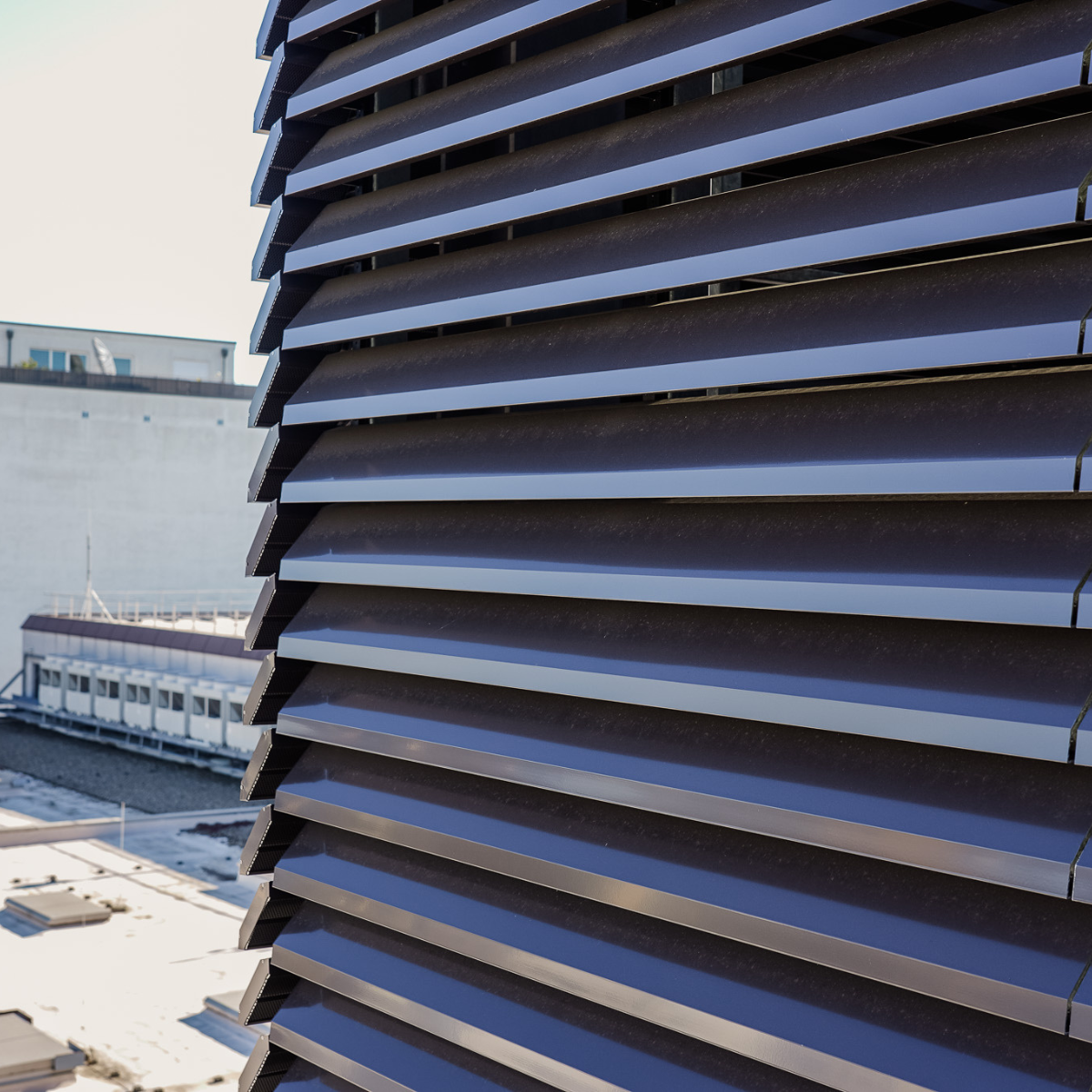 DucoWall Screening Acoustic est un système robuste de bardages à ventelles filantes en aluminium avec atténuation acoustique. Il est possible de choisir entre deux niveaux de lames différents. L'atténuation acoustique peut encore être améliorée par l'application du Double Bank, dans lequel une lame supplémentaire est cliquée à l'arrière. De cette manière, le bardage à ventelles filantes peut être adapté à chaque projet en fonction des souhaits et des besoins. L'installation est rapide, car les lames sont placées directement sur le profilé de support.