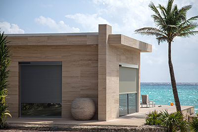 Solozip Solar est un store toile extérieur zippé*, complètement autonome en énergie et entièrement propre.