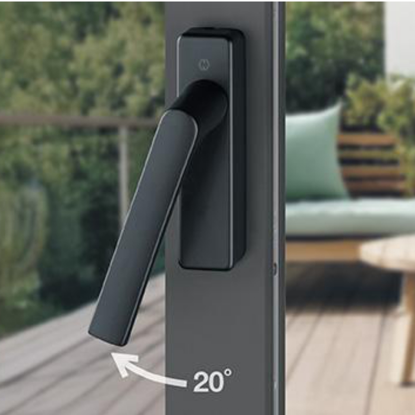 La position à 20° assure une manipulation fluide, permettant notamment d'ouvrir plus facilement les coulissants lourds. La position à 20° de la poignée au lieu de 90° permet une ouverture plus large du coulissant.
