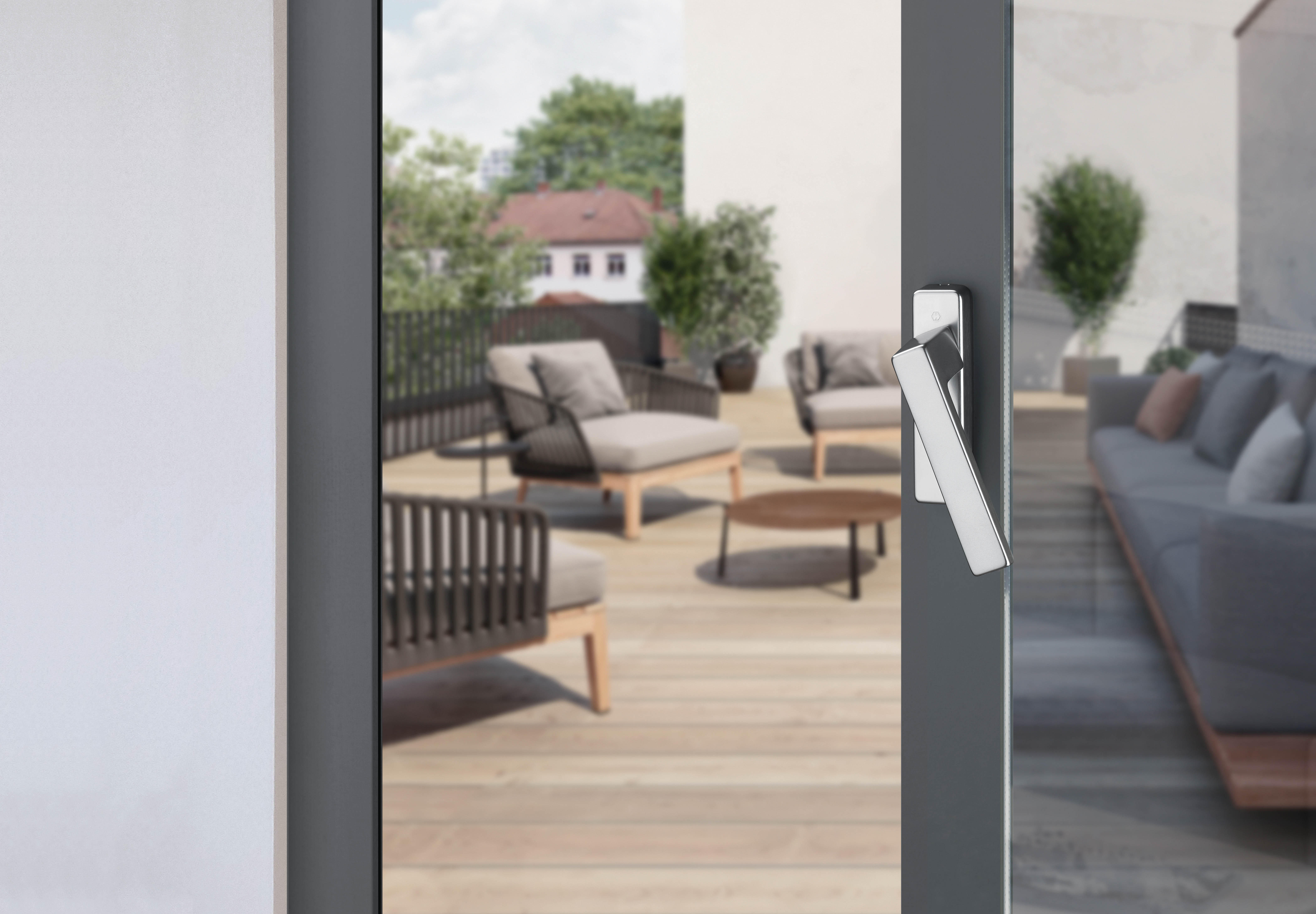 La technologie Ergo20 est intégrée dans la sous-embase de la rosace de poignée, qui est fixée sur la menuiserie selon la méthode habituelle. Afin de garantir une fixation durable sur les coulissants particulièrement lourds, celle-ci peut être vissée sur le profilé grâce à un troisième point de fixation supplémentaire. Le capot enveloppant recouvre entièrement la sous-embase.