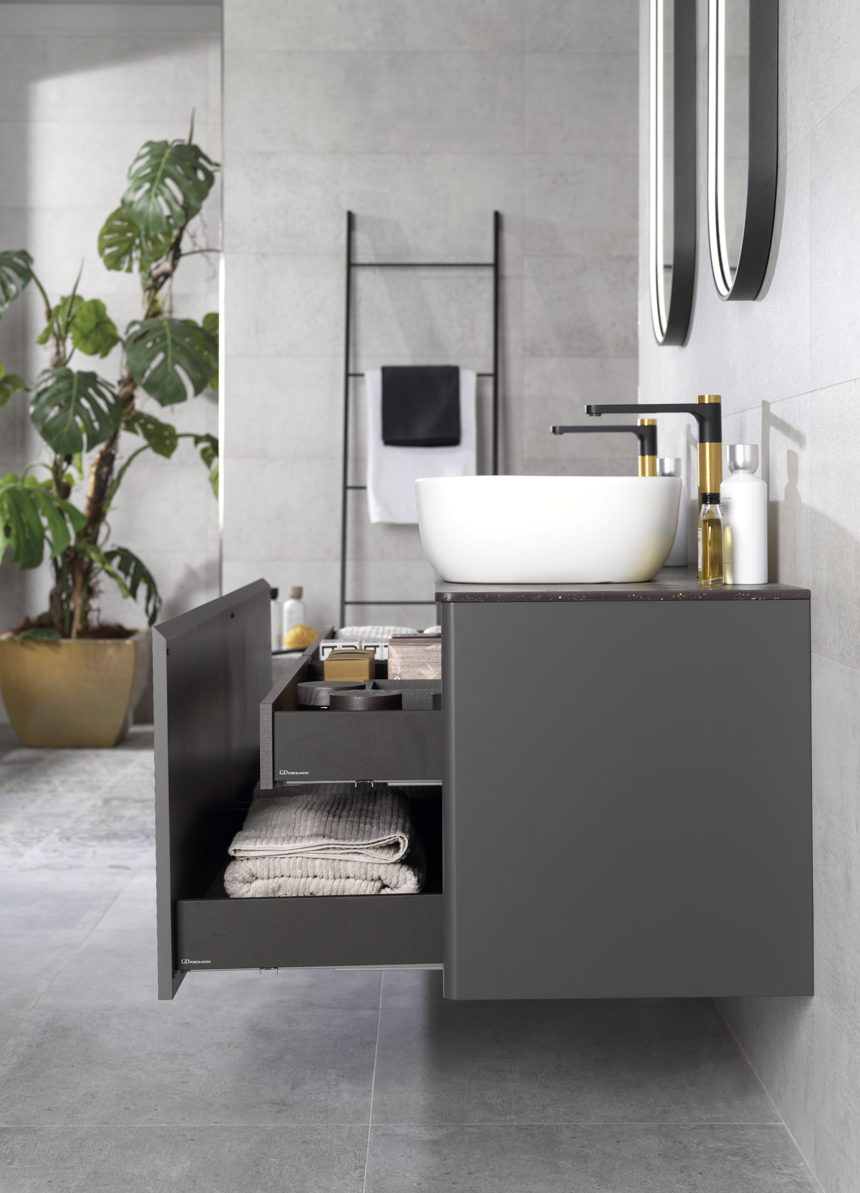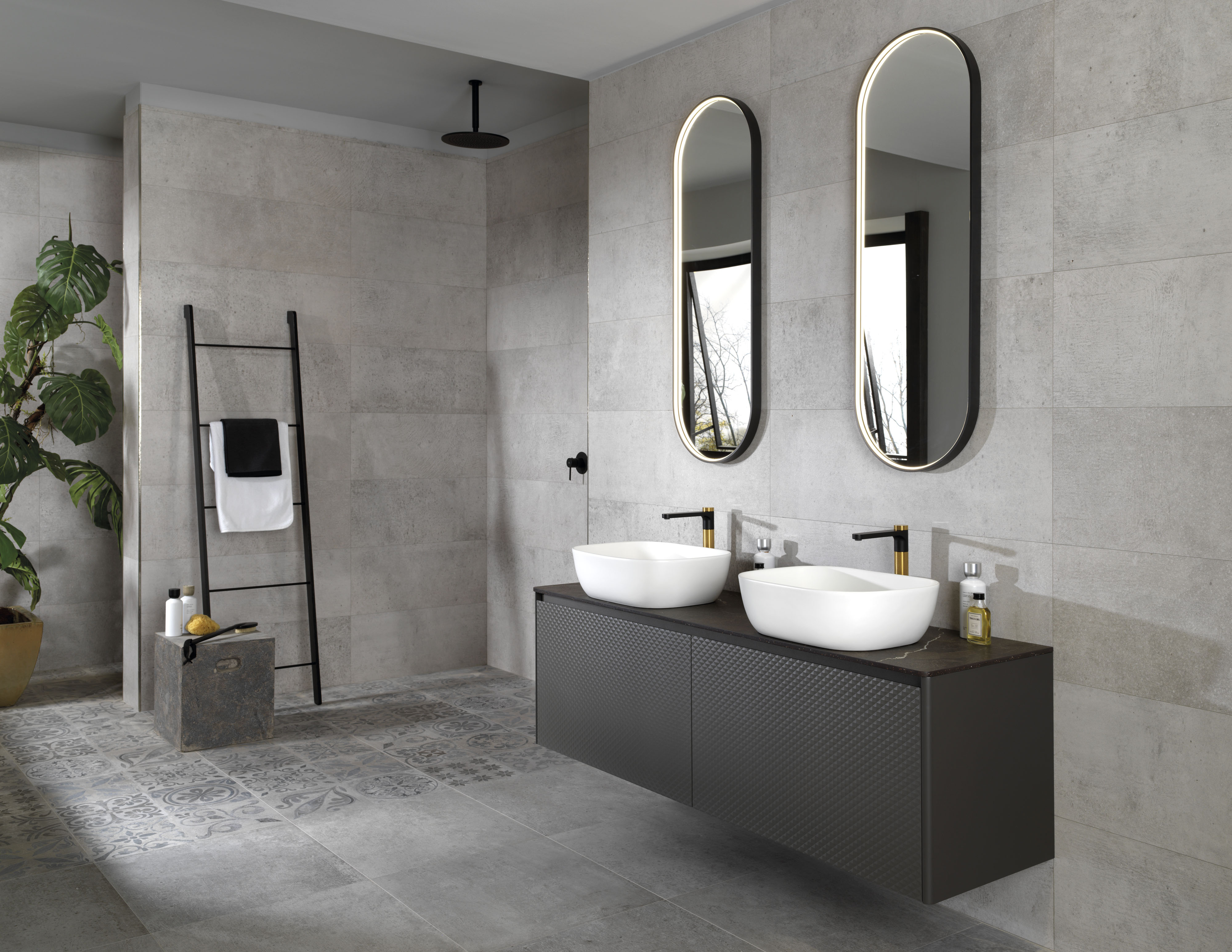 ? Éclairage et contraste : les miroirs ovales avec des cadres en finition Sable ou Golden et un éclairage LED intégré sont non seulement pratiques, mais rehaussent également l'esthétique de l'ensemble.