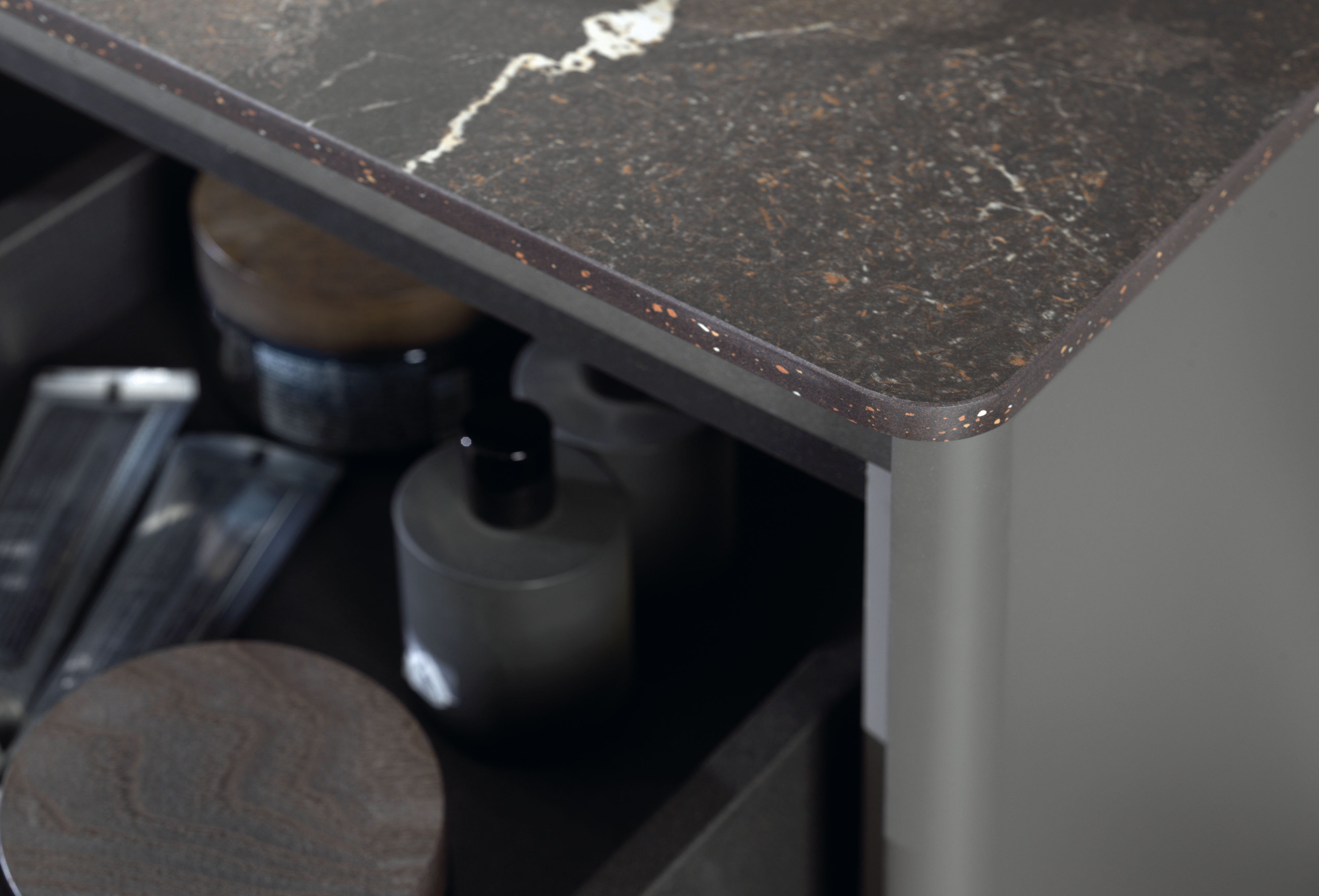 ? Variété de plans de travail et de lavabos : la série permet de choisir entre des plans de travail en pierre naturelle ou en Xtone, offrant également la liberté de choisir entre la pureté visuelle d'un lavabo sous plan ou la mise en valeur esthétique d'un lavabo sur plan.