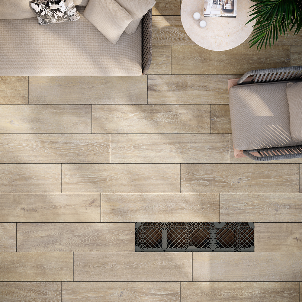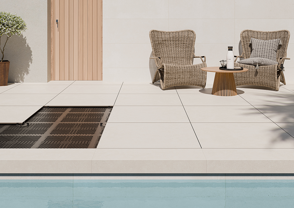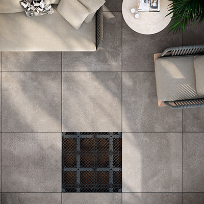 La conception des planchers surélevés extérieurs devient beaucoup plus simple grâce au nouveau concept Grid Raised Surface. Au lieu de placer des plots de support sous chaque dalle (une tâche particulièrement complexe avec les grands formats ou les carreaux en céramique effet bois), ce système consiste d'abord à construire une plateforme surélevée uniformément répartie. Les carreaux en céramique sont ensuite installés librement par-dessus. Ce système facilite également le remplacement des dalles ainsi que la combinaison de différents formats de céramique.