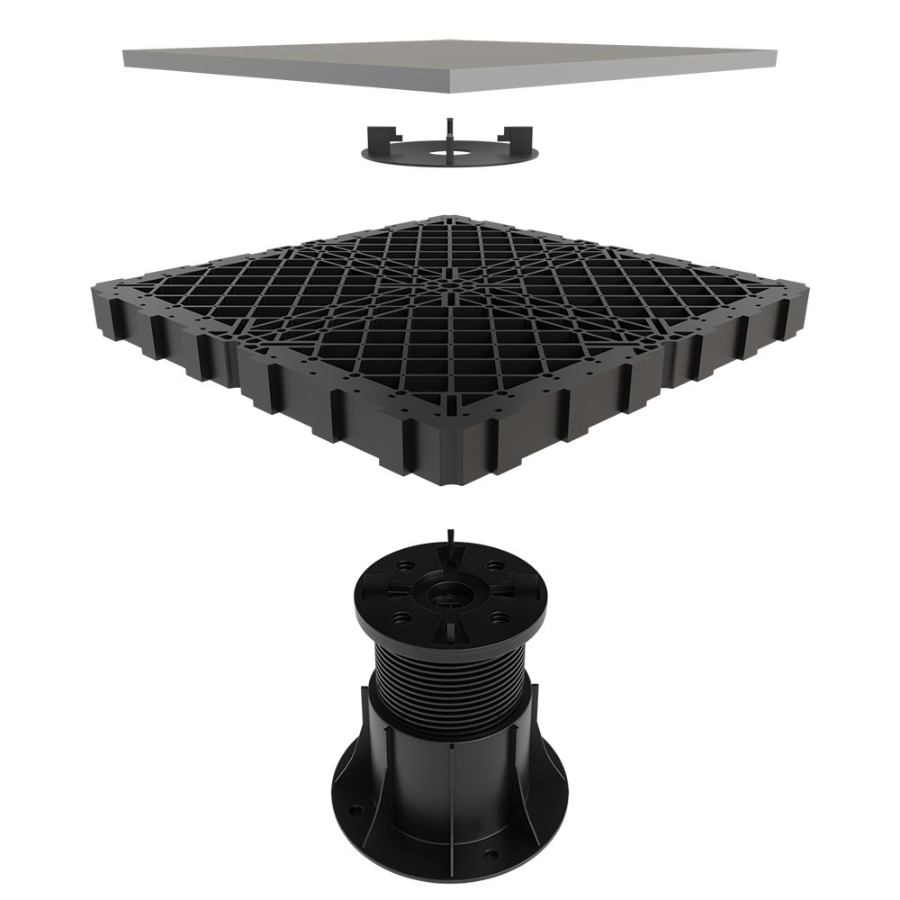 Le système GRID RAISED SURFACE est une alternative au PTSx (Plancher Technique Surélevé Extérieur). Il se compose de grilles en polypropylène de 50x50x4 cm, reliées par un assemblage à rainure et languette sur leur périmètre.