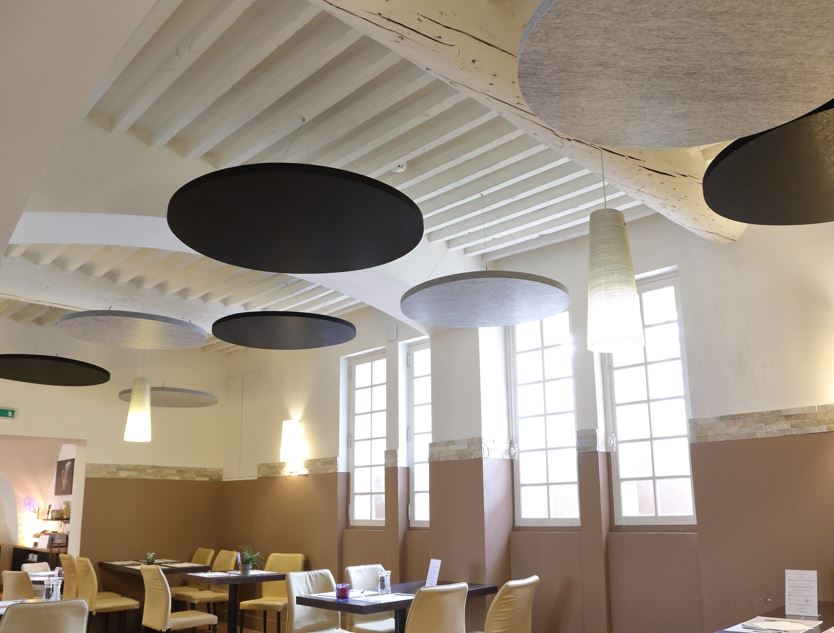 Fabriqués à partir de matériaux recyclés, ignifugés et résistant à l'humidité, avec performances acoustiques certifiées en laboratoire, ils allient efficacité technique et liberté architecturale. Disponibles en différentes formes, dimensions et coloris, ils deviennent de véritables éléments graphiques en plafond.