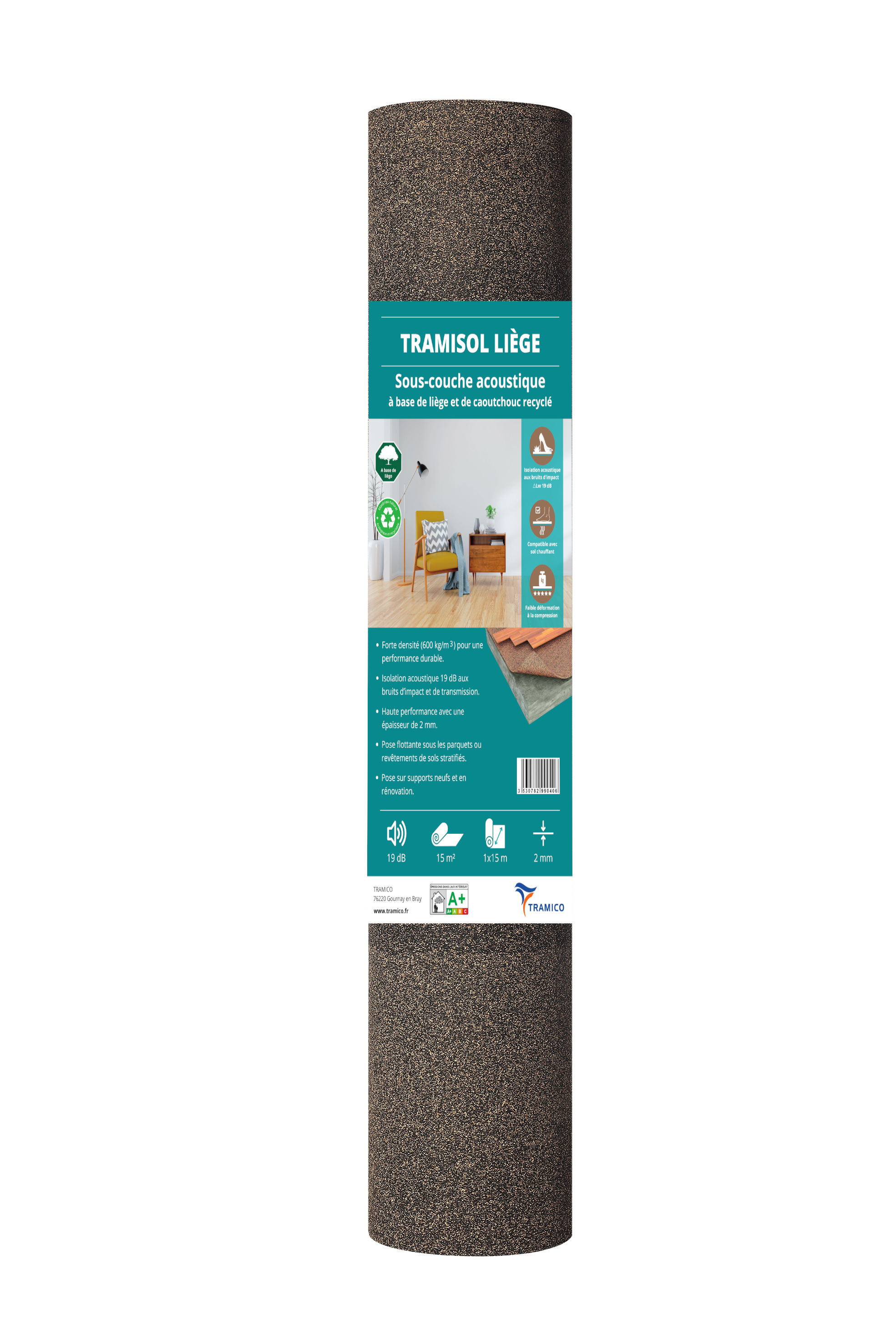 TRAMISOL LIÈGE est une sous-couche acoustique de 2 mm d'épaisseur, composée de liège et de caoutchouc recyclé. Cette sous-couche assure la désolidarisation des parquets et revêtements de sols stratifiés posés dans les immeubles collectifs et maisons individuelles en travaux ou de rénovation.