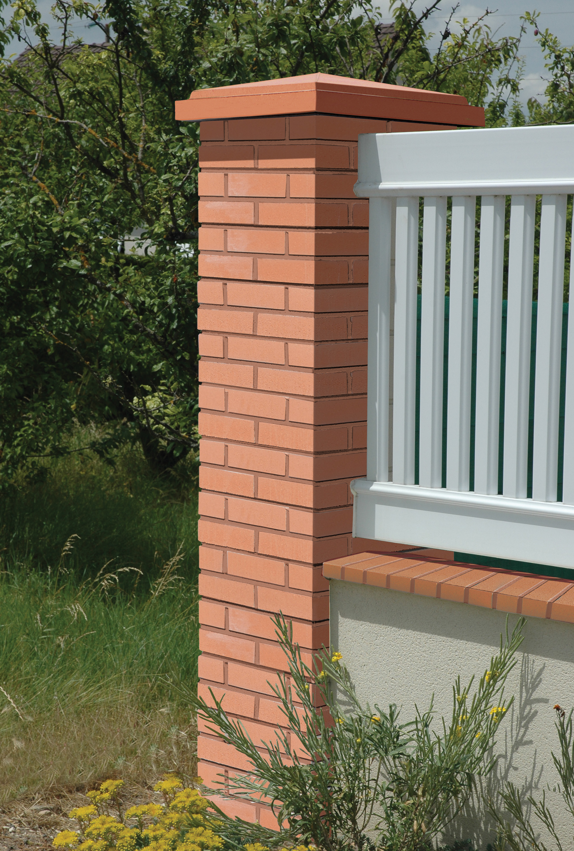 Éléments modulaires dont la mise en œuvre, par emboitement ou collage, est à la portée de tous. Les joints gris des éléments de piliers et plaquettes imitent les traditionnels joints à la chaux, finition indispensable pour donner l'aspect d'un véritable assemblage de briques.